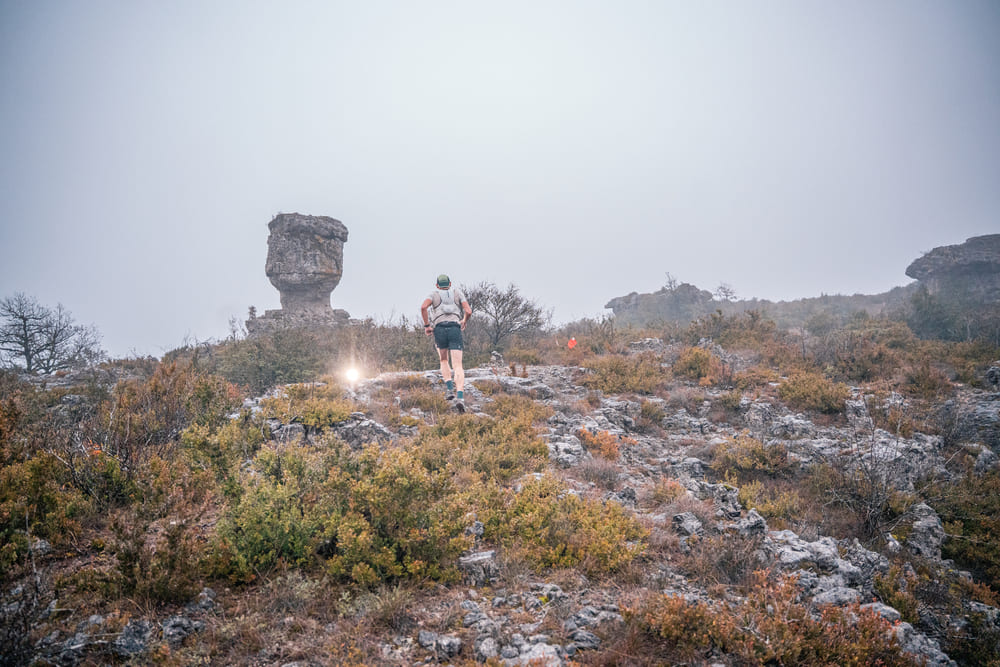 Dans un premier temps, il s’agit de contourner les falaises de Roquesquatres, soit une longue piste parfois humide avec 100 m de D+ comme mise en jambes pour rejoindre le plateau du Larzac avec passage aux rochers et chaos de Roucangel, une bel alignement de petites falaises taraudées par le temps dominant la vallée. On récupère dans une longue partie, cap plein Est, par un sentier caussenard cheminant en douceur, en limite de rupture de pente jusqu’à trouver le sentier technique dévalant ce flanc de causse pour rejoindre l’ancienne gare de Labastide Pradines où est jugé le premier ravitaillement. La course débute vraiment ici par une remontée sur le causse, là on est dans l’esprit Templiers, c’est technique, c’est tortueux, ça dévale, ça grimpe et l’on rejoint Lapanouse de Cernon par d’anciens sentiers de bergers.